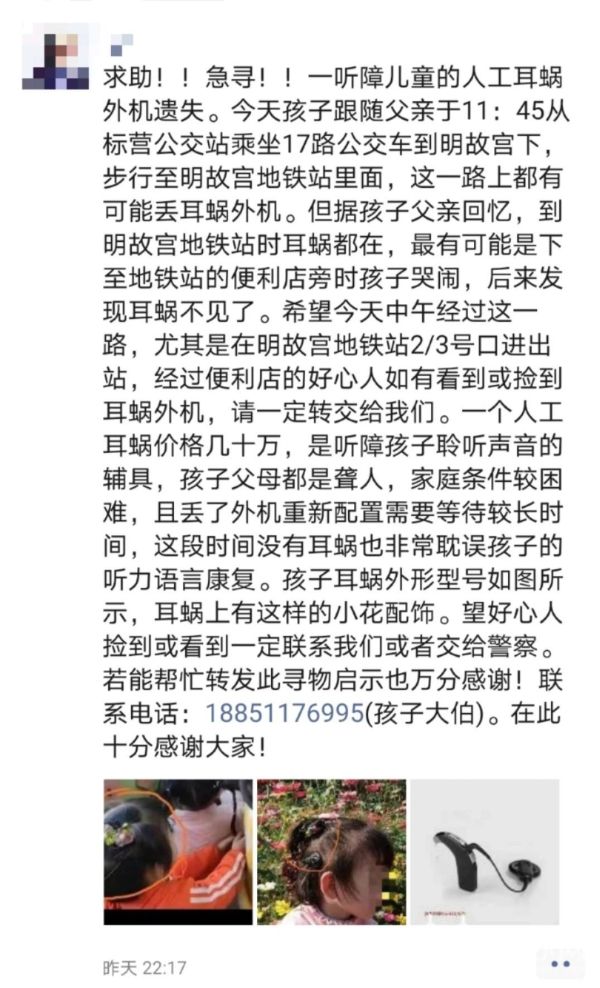 丢失耳蜗的女童父母都是聋哑人,家庭条件一般,当时耳蜗是通过残联的救助项目免费获得的,丢失后家人也联系了厂家,对方表示如果需要重新配置,需要5万元费用。人工耳蜗外挂机对外人来说根本无用,但对侄女来说却特别重要,如果没有了这个耳蜗外挂机,女童就什么也听不到了。就是重新配置也要等待很长时间,而且非常耽误孩子的康复。丢失的耳蜗外挂机是一个类似蓝牙耳机大小的设备,型号是“澳大利亚N6-910/920”,最明显的特征是上面还有一个彩色小花配饰。