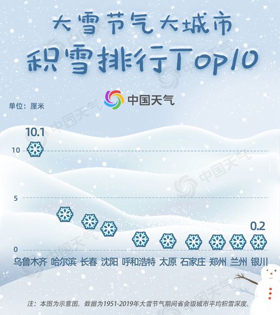 常年大雪节气期间,北方部分地区的平均积雪深度能达到3厘米以上,省会级大城市中,乌鲁木齐最高,达10.1厘米,哈尔滨、长春的平均积雪深度也在3-3.7厘米。从积雪最大深度来看,乌鲁木齐和哈尔滨在大雪节气期间都曾出现过40厘米以上的积雪。