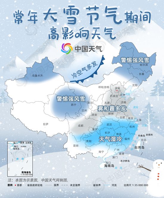 大雪是冬季的第三个节气,标志着仲冬时节开始,至此,天气越来越冷,下雪的可能性大增。中国天气网气象分析师王伟跃介绍,常年大雪期间,北方大部地区天气寒冷,冷空气活动愈加频繁,在东北地区、新疆北部以及西北地区东部等地要注意防范强风雪;在京津冀、河南、山东、山西、陕西南部、四川、重庆等地要警惕雾或霾等低能见度天气的影响;在浙江、江苏、上海、湖北、湖南、江西、贵州等地有降水来袭时,天气比较湿冷,防寒保暖工作也应做好。