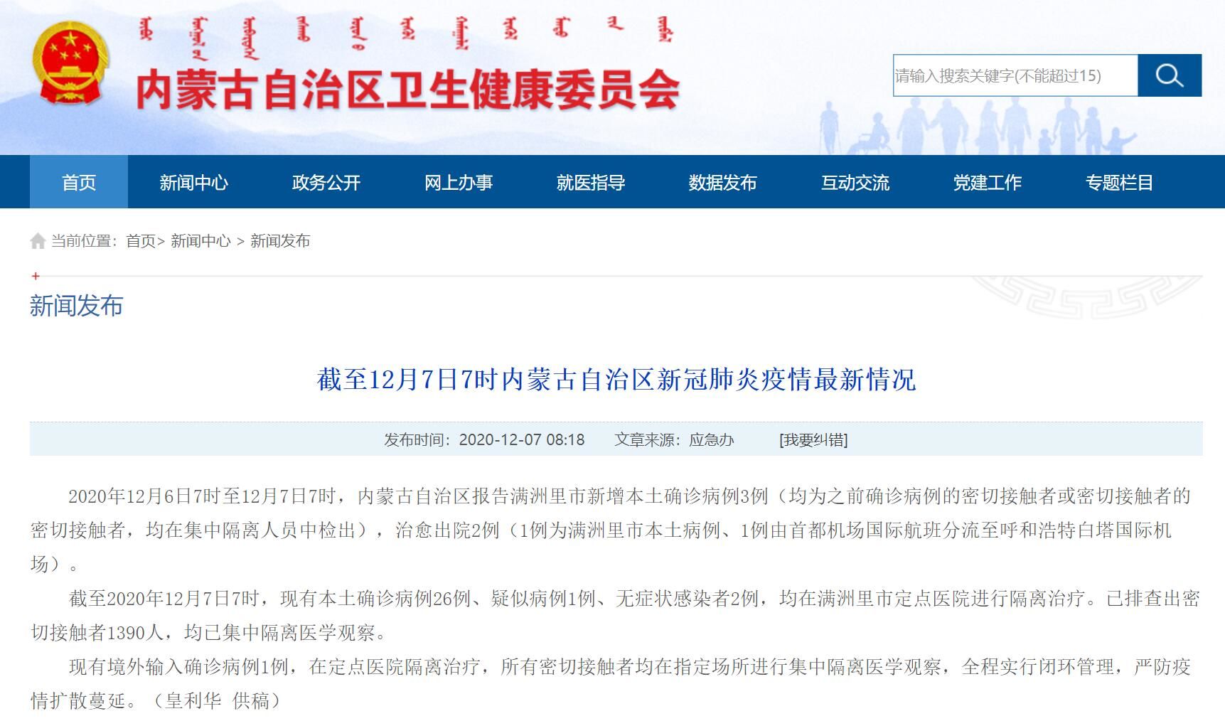 荔枝新闻讯 据内蒙古卫健委官网消息,2020年12月6日7时至12月7日7时,内蒙古自治区报告满洲里市新增本土确诊病例3例(均为之前确诊病例的密切接触者或密切接触者的密切接触者,均在集中隔离人员中检出),治愈出院2例(1例为满洲里市本土病例、1例由首都机场国际航班分流至呼和浩特白塔国际机场)。