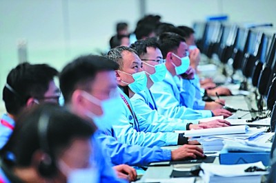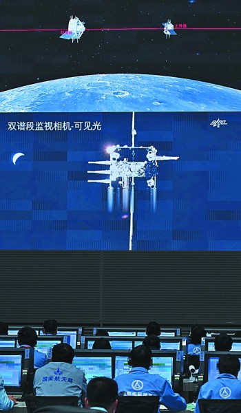 12月6日5时42分,嫦娥五号上升器成功与轨道器返回器组合体交会对接,并于6时12分将月球样品容器安全转移至返回器中。图为航天科技人员在北京航天飞行控制中心指挥大厅监测嫦娥五号上升器与轨道器返回器组合体交会对接情况。新华社记者 金立旺摄