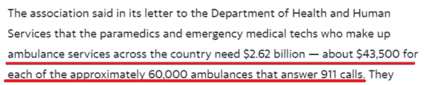 据美国全国广播公司(NBC)报道,美国救护车协会最近要求卫生与公众服务部为全美大约6万辆能响应911呼叫的救护车提供26.2亿美元的紧急资金援助。受疫情影响,这些救护车急需添购更多的个人防护设备和进行额外的消毒工作,而近几个月来,相关设备的价格已上涨了20%以上。