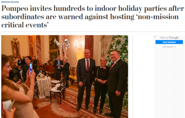 据《华盛顿邮报》报道,一位美国国务院官员证实,未来两周时间里,国务院几乎会“天天举办节日聚会”。比如,美国务卿蓬佩奥就决定在12月15日和16日大开“派对”,届时将邀请数百人参加。