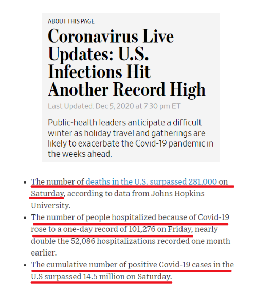 据美国约翰斯·霍普金斯大学最新统计,截至美东时间5日16时15分(北京时间6日5时15分),全美累计新冠肺炎确诊病例超过1450万,病亡人数超过28.1万。而此前一天,美国单日新增确诊病例和住院病例分别达到235635例和101276例,双双刷新了疫情暴发以来的最高纪录。