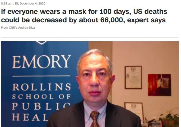 这一模型还预测,如果所有民众都能够坚持佩戴口罩100天,到明年4月1日,大约6.6万名美国人的生命可以被挽救。
