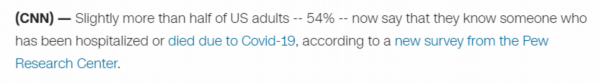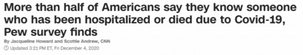据美国媒体报道,在刚刚过去的一周,新冠肺炎成为美国人的第一大死因。皮尤研究中心日前公布的一项民调结果显示,多达54%的美国成年人表示,他们认识的人中有人因感染新冠肺炎入院或死亡。