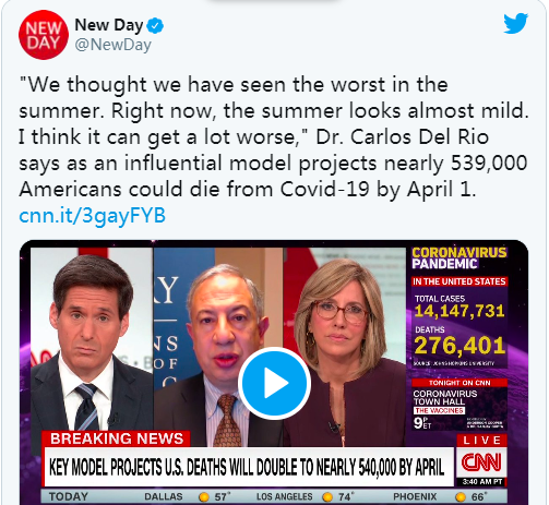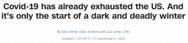 美国有线电视新闻网(CNN)报道指出,疫情已经让美国筋疲力尽,而“黑暗、致命的冬天”才刚刚开始。