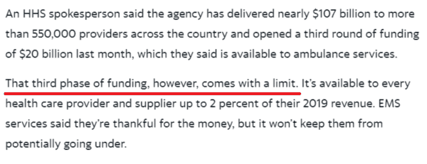 美国卫生与公众服务部的一名发言人称,政府已向全美超过55万家急救机构拨款近1070亿美元,并且在上个月启动了总额200亿美元的第三轮援助。不过多家急救机构表示,这些援助并不足以帮助他们渡过难关。