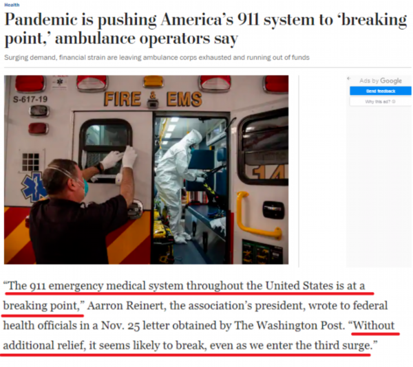 随着疫情的失控,美国医疗体系已不堪重负,曾经享誉全球的美国911急救系统也已接近极限。美国救护车协会主席阿伦·雷纳特近日表示,如果没有额外的政府援助,911急救系统终将在第三波疫情暴发之际崩溃。