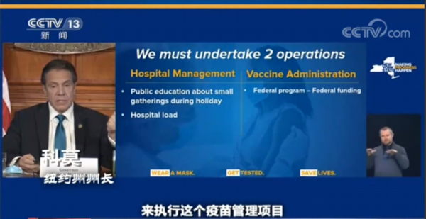 纽约州州长 科莫:我们需要联邦拨款来执行这个疫苗管理项目,需要强有力的外展工作让社会接受疫苗,对疫苗有信心。我是不是可以为此部署国民警卫队,是不是可以想办法鼓励民众来接种疫苗?当然可以,但这取决于经费。