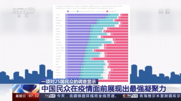近日,英国舆观调查公司和剑桥大学共同展开的一项调查显示,68%的中国受访者表示,自新冠肺炎疫情发生以来,本国的社会凝聚力提高。这一比例在所有受访国家民众中最高,俄罗斯卫星通讯社报道称,这显示出中国民众在疫情面前表现出了最强的凝聚力。