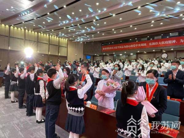 会上,在高亢嘹亮的小号声中,江苏省抗疫先进事迹报告团的八位成员在观众的热烈掌声中依次步入会场,少先队员们以鲜花和敬礼表达对抗疫优秀代表们崇高的敬意。