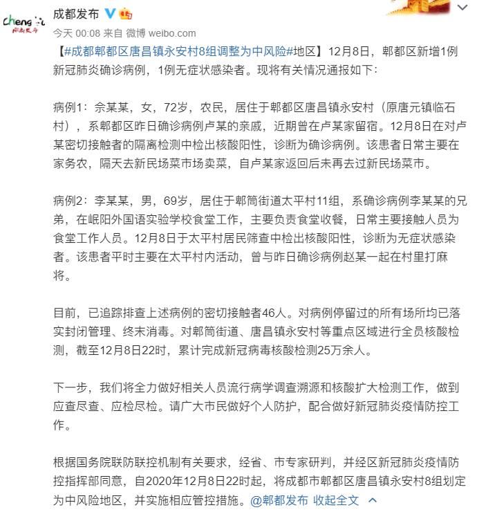 根据国务院联防联控机制有关要求,经省、市专家研判,并经区新冠肺炎疫情防控指挥部同意,自2020年12月8日22时起,将成都市郫都区唐昌镇永安村8组划定为中风险地区,并实施相应管控措施。