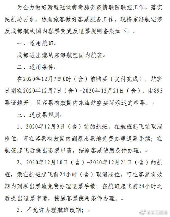 荔枝新闻讯 据@东海航空微博消息,近期有成都出行计划的旅客请注意,东海航空涉及成都航线国内客票变更及退票规则现已出台。成都进出港的东海航空国内航班在12月7日0时(含)前购买(支付完成),航班日期在12月7日(含)-12月21日(含),由893票证填开,且客票有效期内东海航空实际承运的客票,12月9日(含)前航班起飞前取消座位,可在客票有效期内到原出票地免费办理退票手续;在航班起飞后提出退票申请,按原客票使用条件办理。