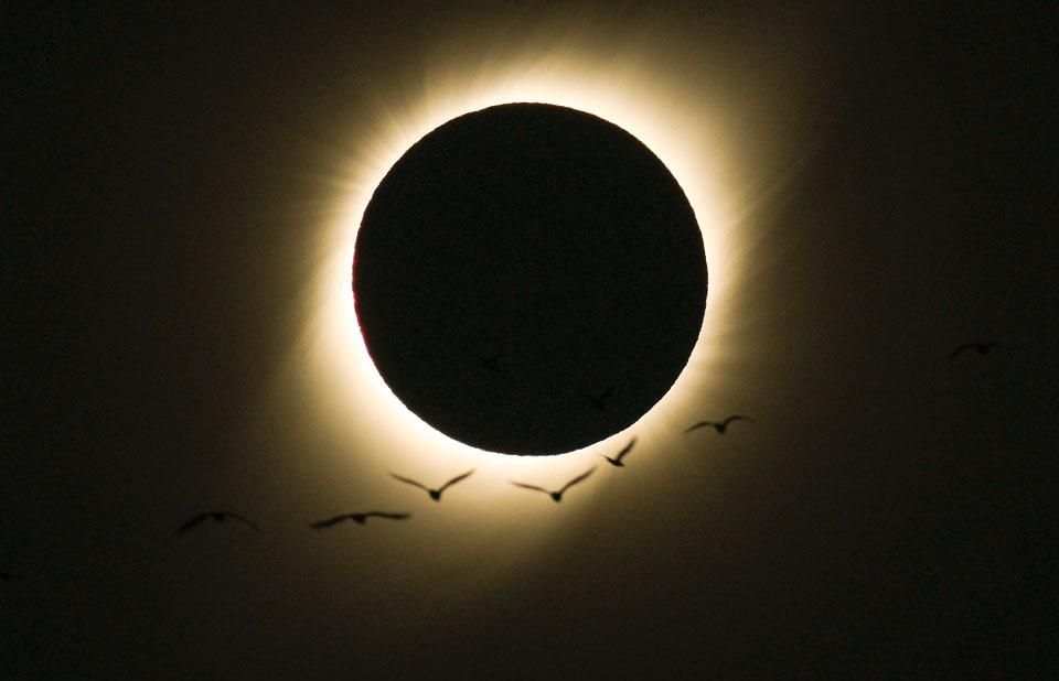 在月亮穿过太阳表面24分钟的时间里,仅有2分9.6秒彻底遮住太阳。虽然月亮的直径大约只有太阳直径的1/400,但由于它离地球更近,所以看起来要大得多,因此能够遮蔽太阳圆盘,形成日全食现象。