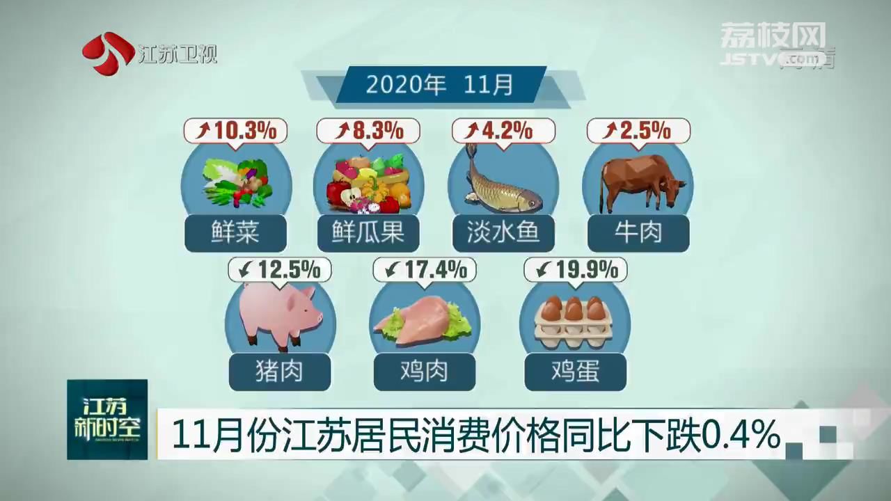 记者12月9日从国家统计局江苏调查总队获悉,11月,江苏居民消费价格同比下跌0.4%。其中,猪肉价格下跌12.5%,拉动CPI下降0.57个百分点。