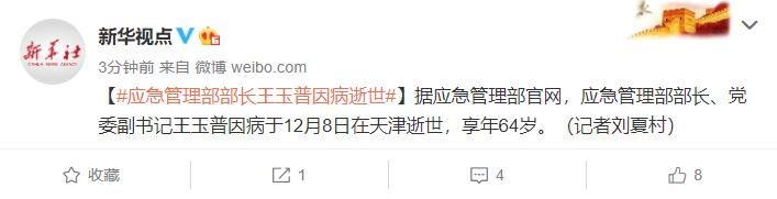 据应急管理部官网,应急管理部部长、党委副书记王玉普因病于12月8日在天津逝世,享年64岁。(记者刘夏村)