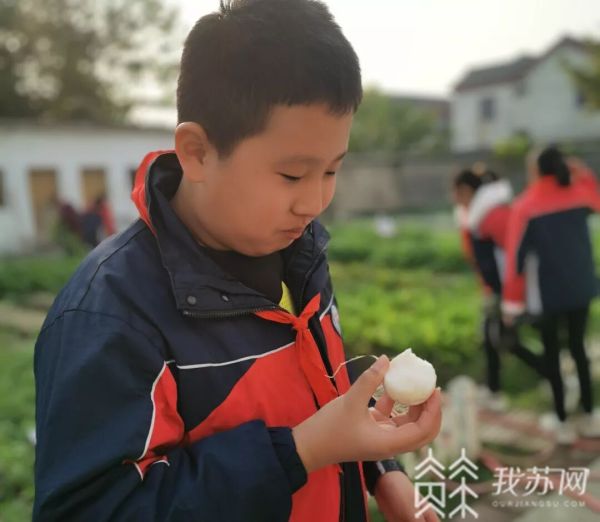 开学以来,邗江实小的孩子们在各班的责任田里翻地、播种、施肥、浇水、锄草,忙得不亦乐乎。经过半学期的劳动,农耕基地里的萝卜田已是一片绿意。六(1)班的学生们在班主任带领下走进萝卜田劳动,体会农耕之乐,品尝丰收之果。他们仔细地打量着田地里那些露出“肚皮”的萝卜们,再凑近了瞧一瞧,用手比划比划,只待老师一声令下,随时准备“下手”。