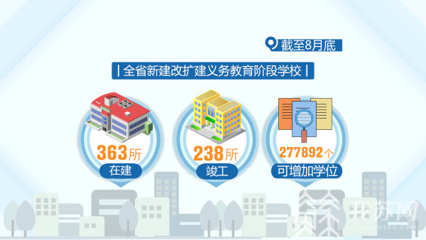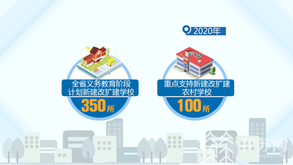 2020年,全省义务教育阶段计划新建改扩建学校350所,重点支持新建改扩建农村学校100所。截至8月底,全省新建改扩建义务教育阶段学校在建363所,竣工238所,可增加学位277892个。目前,全省近90%的义务教育学校达到省定办学标准,农村义务教育学校办学条件持续改善。