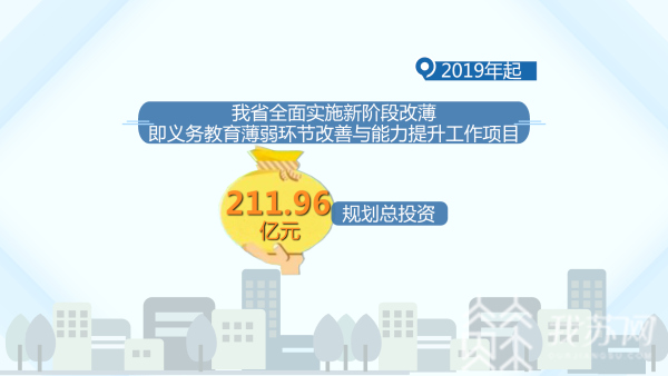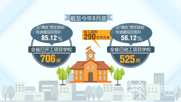 2019年起,我省全面实施新阶段改薄即义务教育薄弱环节改善与能力提升工作项目,规划总投资211.96亿元。截至今年8月底,全省已开工项目学校706所,占"薄改"两年规划校舍建设总面积的85.12%。全省已竣工项目学校525所,竣工面积290万平方米,占"薄改"两年规划校舍建设总面积的56.12%。