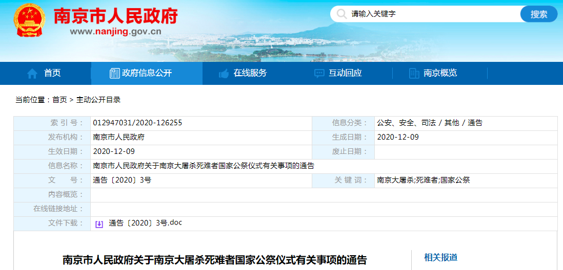 南京市人民政府关于南京大屠杀死难者国家公祭仪式有关事项的通告