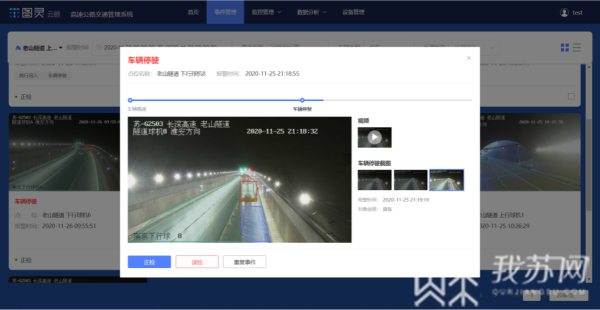 2020年11月25日21时18分,老山隧道往淮安方向一辆厢式货车停在施工围挡区域检修车辆。系统监测到后发出车辆停驶预警。接到预警后大队立即指令管理方利用隧道内喊话器提示驾驶员尽快驶离,及时消除安全隐患。