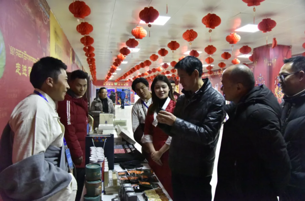 那曲市副市长母兴斌查看索朗扎巴的产品。记者 刘凡 摄