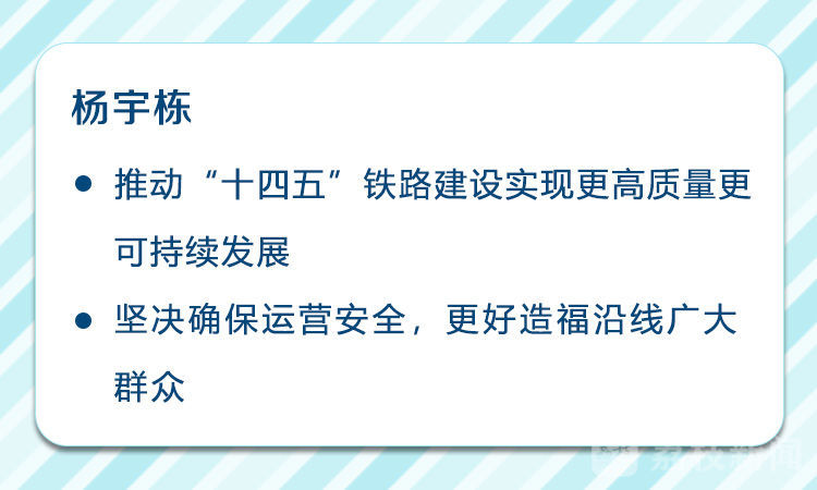 杨宇栋代表国家铁路集团对连淮扬镇铁路淮镇段暨五峰山长江大桥建成运营表示祝贺。他说,近年来,江苏省委、省政府高度重视、大力支持铁路工作,推动全省铁路特别是苏北高铁实现快速发展,有力保障国家重大战略实施。连淮扬镇铁路淮镇段暨五峰山长江大桥建成运营,是江苏省和国家铁路集团学习贯彻习近平总书记重要讲话精神,落实党的十九届五中全会精神,推动高质量发展的实际行动。国家铁路集团将认真贯彻落实习近平总书记对江苏工作和铁路工作的重要指示精神,推动“十四五”铁路建设实现更高质量更可持续发展。上海局集团要牢固树立人民铁路为人民的宗旨,不断提升服务质量,坚决确保运营安全,更好造福沿线广大群众。