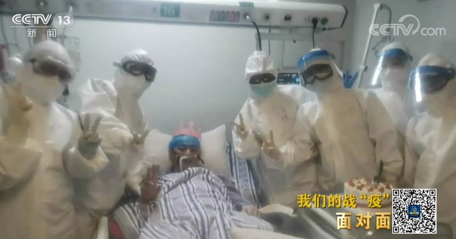 生日那天,同事们送给他一个代表鼠年的玩偶作为礼物。蔡利萍也赶到医院陪丈夫过生日。照片中,刘智明微笑着比出胜利的手势。