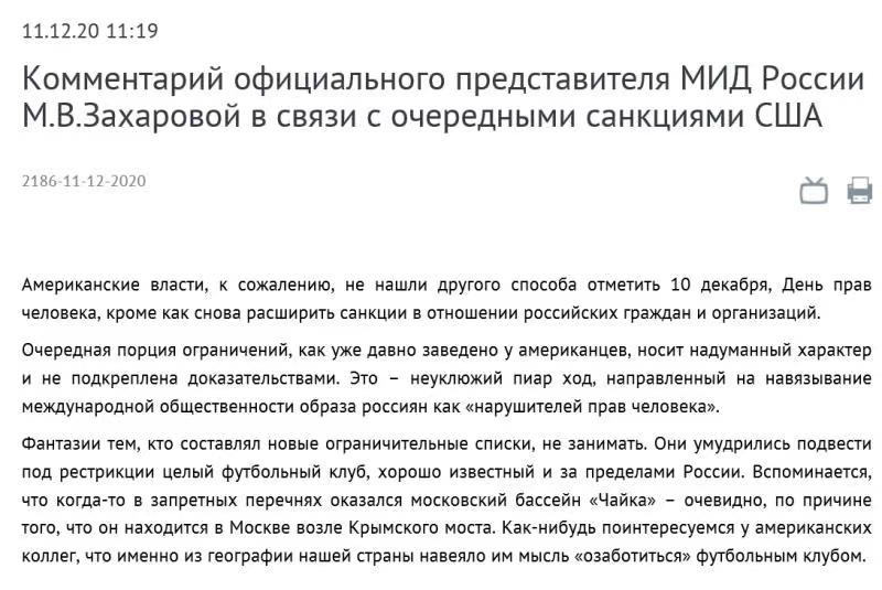 当地时间12月11日,俄罗斯外交部新闻发言人扎哈罗娃在俄外交部官网上发表评论,批驳美国新一轮对俄制裁毫无依据。