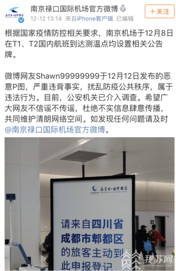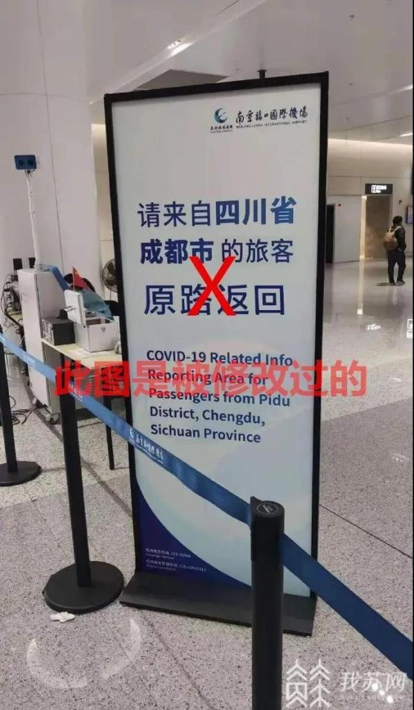 今天(12月12日)上午,一张疑似南京禄口国际机场在接机口标注“请来自四川省成都市的游客原路返回”的照片在网上流传,引起了众多网友的热议。真实情况如何呢?