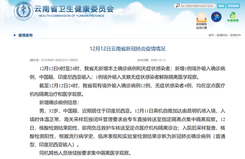 荔枝新闻讯 据云南省卫健委网站消息,12月12日0时至24时,云南省无新增本土确诊病例和无症状感染者;新增1例境外输入确诊病例,中国籍、印度尼西亚输入;1例境外输入关联无症状感染者解除隔离医学观察。截至12月12日24时,云南省现有境外输入确诊病例12例、无症状感染者4例,均在定点医疗机构隔离治疗和医学观察。