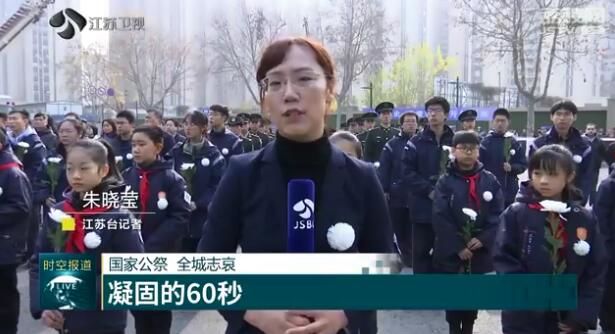 江苏台记者朱晓莹说:“伴随着凄厉的警报声,路面、江面汽笛齐鸣,现场的近200位社会各界代表垂首默哀,共同悼念83年前遇难的30万同胞。”