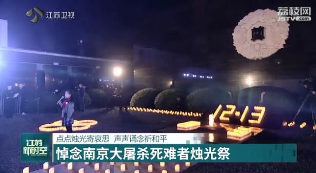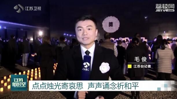 江苏台记者毛俊说:“这里是侵华日军南京大屠杀遇难同胞纪念馆祭场,夜幕降临,烛光祭已经开始了,在祭场中央黑色的石墙上,白色的花圈围绕着一个巨大的奠字,下方是熊熊燃烧的长明火。冬日的夜空中,小号演奏的一首《南京记忆》如泣如诉,现场庄严肃穆。”