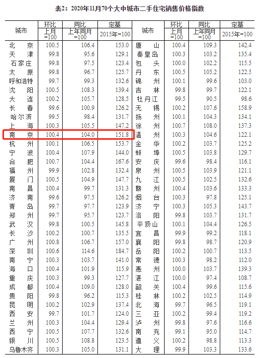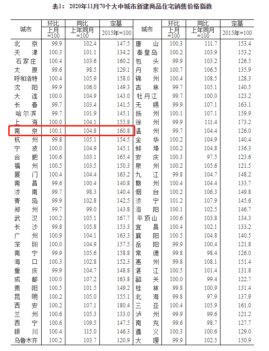 刚刚,国家统计局发布《2020年11月份70个大中城市商品住宅销售价格变动情况》。数据显示:今年11月份,南京新房价格环比上涨0.1%,同比涨4.8%;二手房环比上涨0.4%,同比上涨4.0%。