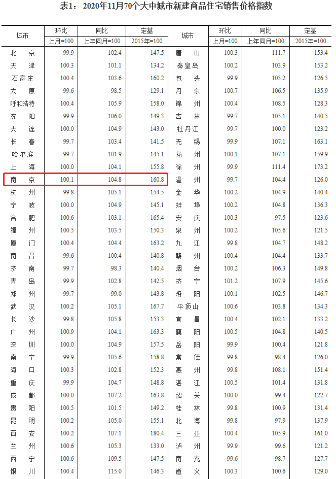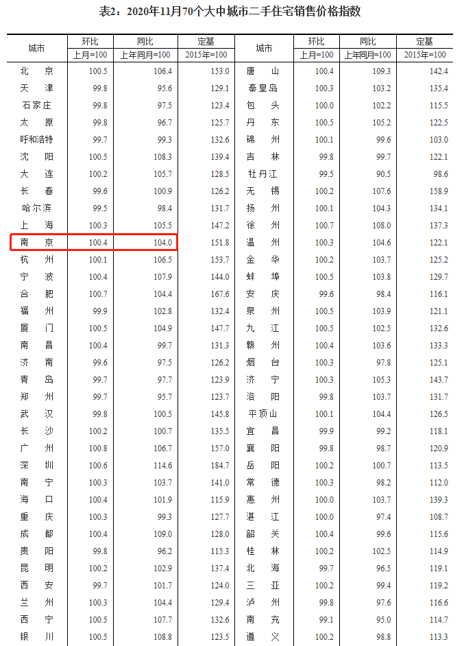 扬子晚报网12月14日讯(记者 马祚波)12月14日,国家统计局公布了今年11月份全国70个大中城市商品住宅价格指数,南京新房价格环比再涨0.1%,涨幅有所收缩,同比上涨4.8%;二手房价格环比涨了0.4%,同比上涨4.0%。