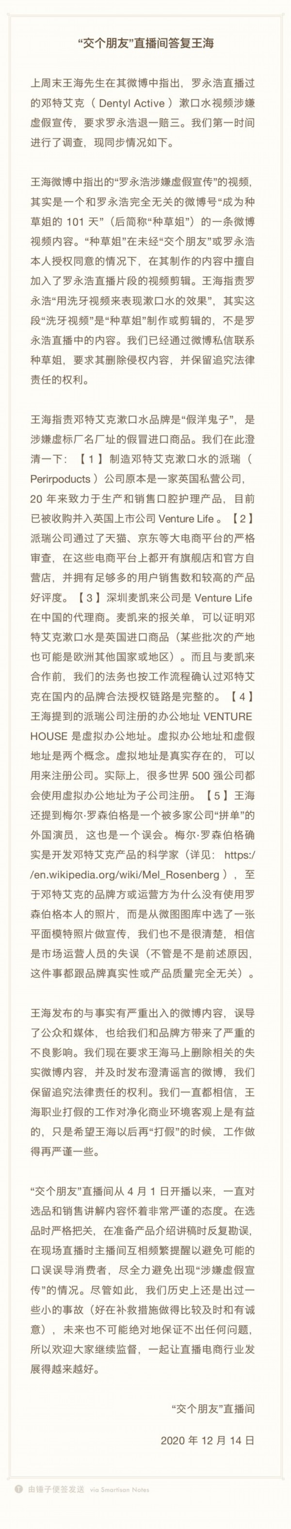 交个朋友在公告里表示,王海微博中指出的“罗永浩涉嫌虚假宣传”视频是一个和罗永浩完全无关的微博号发布的一条视频内容,该微博号在未经授权的情况下擅自加入了罗永浩直播剪辑片段,并非罗永浩直播中的内容,交个朋友已私信要求删除侵权内容。
