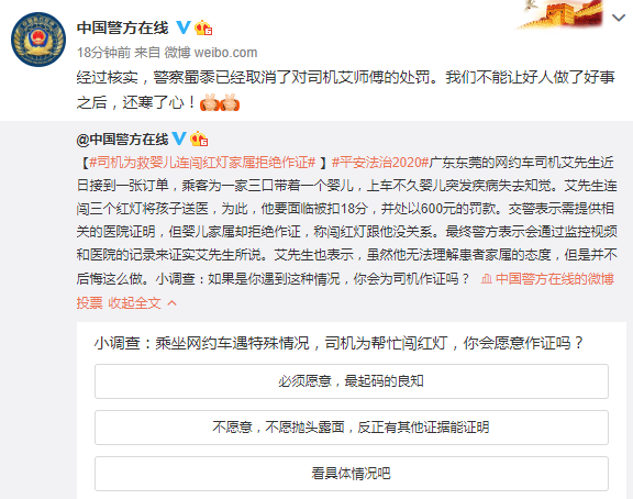 荔枝新闻讯 据公安部新闻中心,公安部治安管理局官方微博消息,近日,有媒体报道称,广东东莞一网约车司机艾先生近日接到一张订单,乘客为一家三口带着一个婴儿,上车不久婴儿突发疾病失去知觉。艾先生连闯三个红灯将孩子送医,为此,他要面临被扣18分,并处以600元的罚款。交警表示需提供相关的医院证明,但婴儿家属却拒绝作证,称闯红灯跟他没关系。随后,警方表示会通过监控视频和医院的记录来证实艾先生所说。