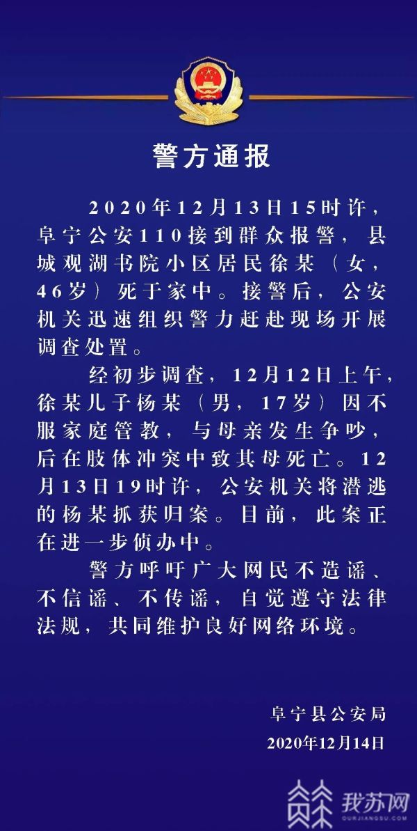 阜宁警方在通报中称,经初步调查,12月12日上午,徐某儿子杨某(男,17岁)因不服家庭管教,与母亲发生争吵,后在肢体冲突中致其母死亡。12月13日晚7时许,公安机关将潜逃的杨某抓获归案。目前,此案正在进一步侦办中。