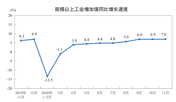 11月份,规模以上工业增加值同比实际增长7.0%(以下增加值增速均为扣除价格因素的实际增长率),增速较10月份加快0.1个百分点。从环比看,11月份,规模以上工业增加值比上月增长1.03%。1—11月份,规模以上工业增加值同比增长2.3%。