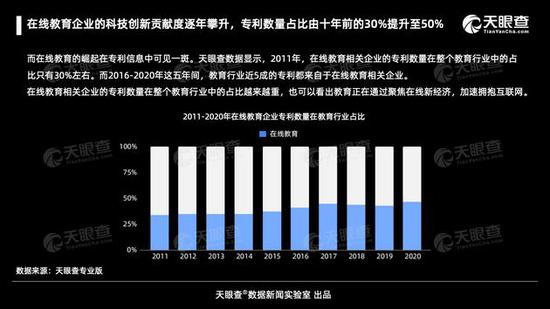 12月15日下午消息,天眼查专业版数据显示,2011年,在线教育相关企业的专利数量在整个教育行业中的占比只有30%左右。而2016-2020年这五年间,教育行业近5成的专利都来自于在线教育相关企业。