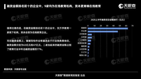 值得注意的是,以上数据显示,在今年上半年融资金额排名前十的企业中,仅万学教育一家线下机构,其余9家全部为在线教育企业。