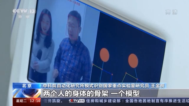 中国科学院自动化研究所模式识别国家重点实验室研究员 王金桥:这就是人脸识别技术,因为你对它来说是一个新面孔,可以对我们人的十八个关键点做一个精准的定位,两个人的身体的骨架构成一个模型,当我们动的时候,模型也随着身体的摆动而做出相应动作。