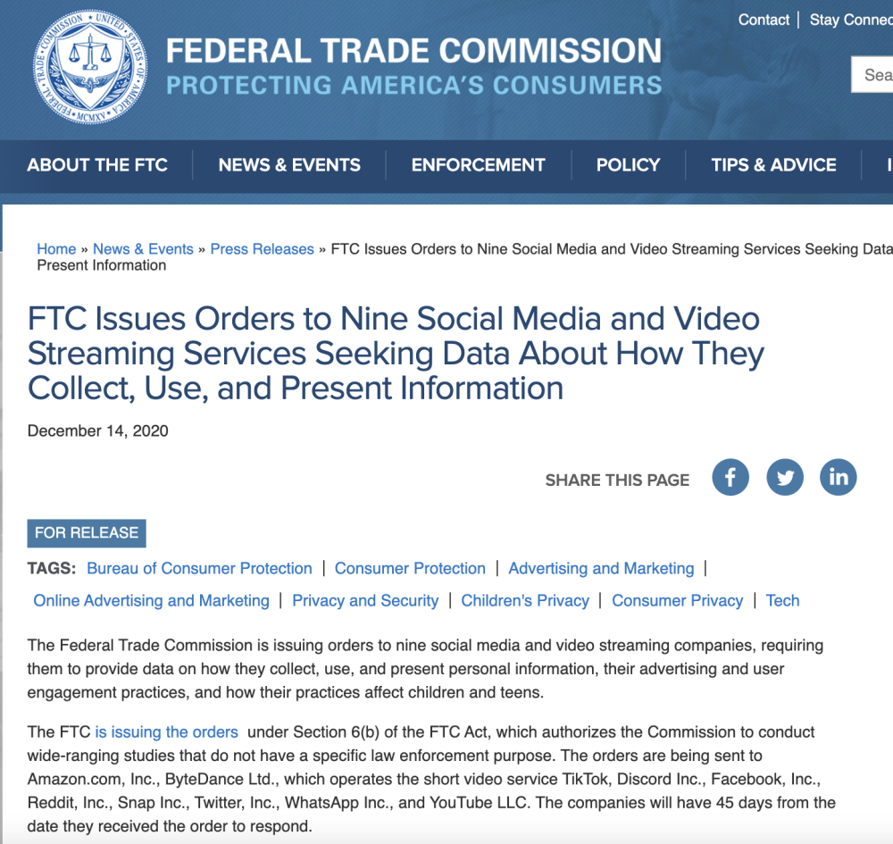根据当天美国联邦贸易委员会发布的新闻稿,亚马逊、TikTok中国母公司字节跳动,聊天及社群软件Discord,Facebook及其子公司Whatsapp,Reddit,Snap,Twitter 和谷歌旗下视频网站YouTube均被发送命令,要求上交他们的数据实践信息。这些科技公司有45天时间做出回应。