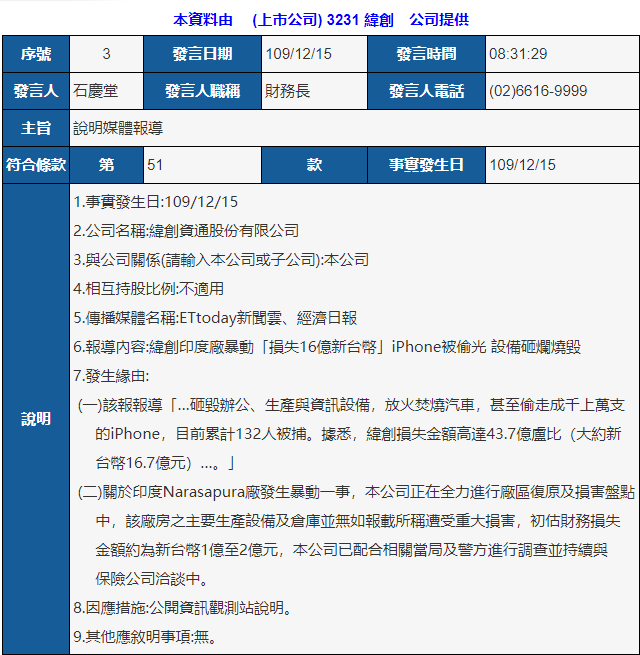 但纬创公司在公告中表示,“该厂房的主要生产设备及仓库并无如报载所称遭受重大损害,初估财务损失金额约为新台币1亿至2亿元,本公司已配合相关当局及警方进行调查,并持续与保险公司洽谈中。”