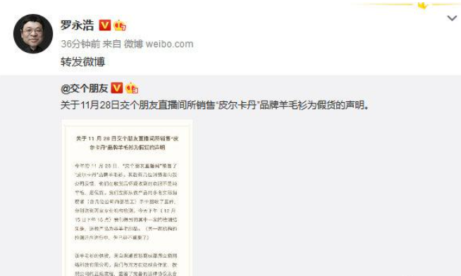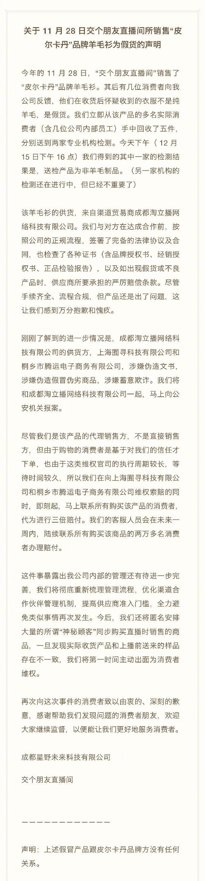 荔枝新闻讯 罗永浩 “交个朋友”直播间今日承认部分羊毛衫为假货,将报案并先行赔付。交个朋友在微博上表示,日前有消费者表示在“交个朋友直播间”购买的“皮尔卡丹”品牌羊毛衫不是纯羊毛,是假货。“交个朋友”回收5件送检发现确为非羊毛制品。产品出了问题,为此感到万分抱歉和愧疚。经核实,羊毛衫供货商方面涉嫌伪造文书,销售假冒伪劣商品。“交个朋友”将和渠道贸易商成都淘立播网络科技有限公司一起,马上向公安机关报案。此外,将先行对购买到假羊毛衫的消费者代为进行三倍赔付,客服人员会在未来一周内,陆续联系所有购买该商品的两万多名消费者办理赔付。
