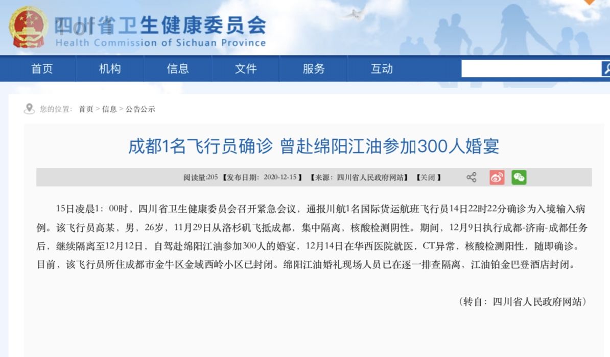 公告显示,期间,高某于12月9日执行成都-济南-成都任务后,继续隔离至12月12日,自驾赴绵阳江油参加300人的婚宴,12月14日在华西医院就医,CT异常,核酸检测阳性,随即确诊。