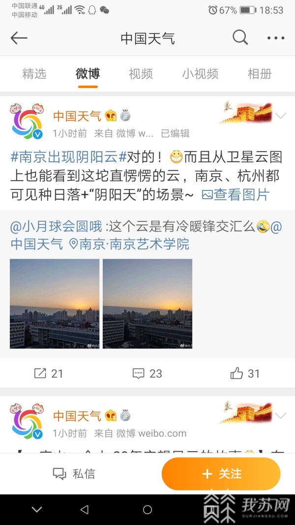 据@中国天气 发布说,此种天象是冷暖空气交锋所致,从卫星云图上也能看到这坨直愣愣的云,南京、杭州都可见种日落+“阴阳天”的场景。