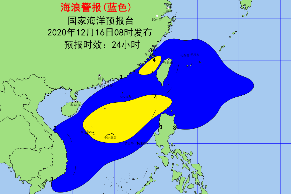 12月16日中午到17日中午,东海南部、钓鱼岛附近海域将出现3到3.5米的大浪区,台湾海峡将出现3.5到4.5米的大浪到巨浪区;