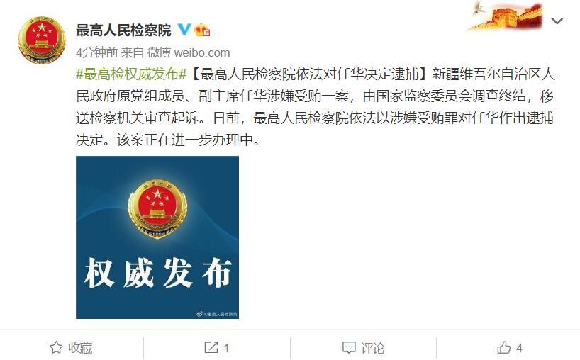 新疆维吾尔自治区人民政府原党组成员、副主席任华涉嫌受贿一案,由国家监察委员会调查终结,移送检察机关审查起诉。日前,最高人民检察院依法以涉嫌受贿罪对任华作出逮捕决定。该案正在进一步办理中。